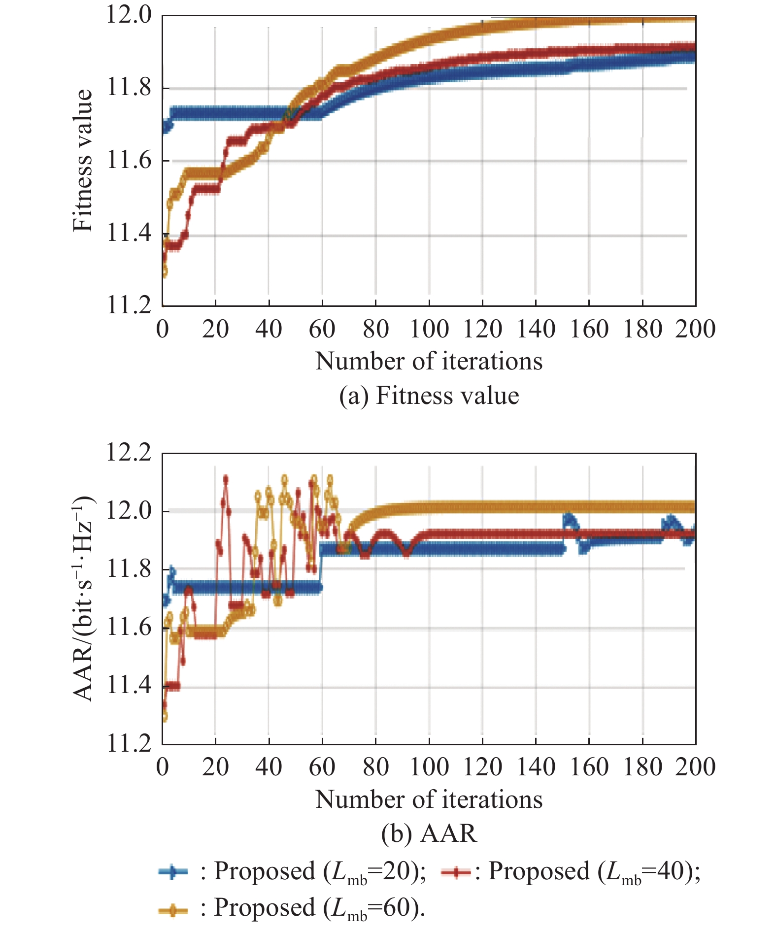 Fig. 5 shows the impact of different mini-batch sizes on the convergent AAR. It is observed that all proposed algorithms with different Lmb values can converge within 200 iterations. As can be seen in the top subfigure, the proposed algorithm with small Lmb values exhibits a slight improvement of fitness gap, while the algorithm can gain a sharp improvement with large Lmb values. Comparing the two subfigures, however, we see that the subfigures do not exhibit the same upward trend. In particular, the bottom subfigure does not show a monotonic curve. This is reasonable because of the stochastic nature of the considered mini-batch sampling surrogate function.