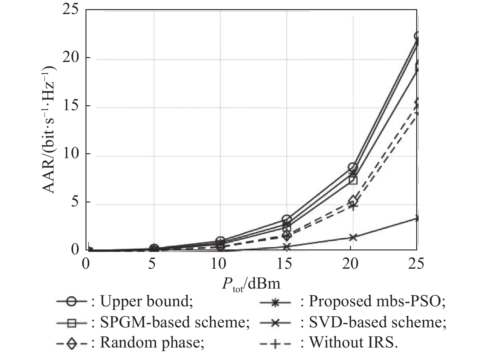 Five baselines are used for comparison, which is given as follows: (i) Upper bound: the PSO method is performed by using the AAR object in (P3) as the fitness function where each iteration requires large-scale channel samples. (ii) Sum-path-gain maximization (SPGM)-based scheme [17]: the long-term reflection matrix is obtained via the SPGM-based optimization method. (iii) SVD-based scheme: we adopt the conventional SVD-based MIMO processing architecture, where the transmit powers are optimized by considering the O-CSI as the ideal CSI in each slot. (iv) Random phase: based on the SVD-ZF, we adopt the randomly generated long-term reflection matrix to optimize the transmit powers by using (15). (v) Without IRS: based on the SVD-ZF, we just optimize the transmit powers to optimize the overall sum rate in one frame.