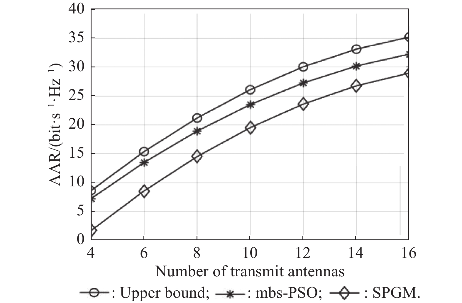 In Fig. 7, the AAR is plotted against the number of BS antennas, where the number of receive antennas is fixed as Nu = 4. It is seen that the AAR curves for all schemes show an approximately logarithmic shape. Although the number of receive antennas keeps constant, more transmit antennas can still provide a higher spatial diversity gain in the downlink transmission. Hence, the sum rate is improved with the increasing transmit antennas because the downlink SINR is increased. Also, the SPGM-based method performs the worse among all methods, which is consistent with the results in Fig. 6.
